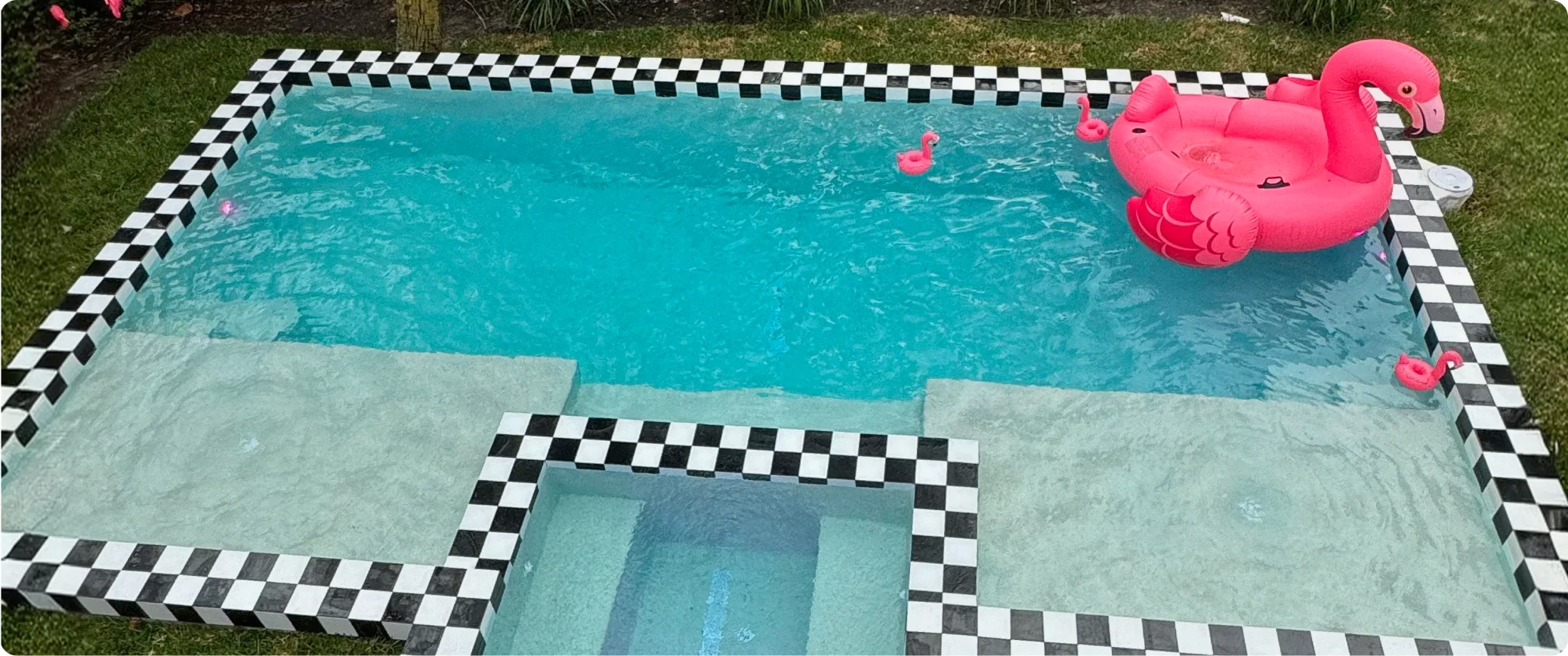 For Michael and Jordan—a young, creative couple with modern taste—this pool was designed to match the personality of their retro-inspired home. Michael, an artist and landscape architect, and Jordan, owner of Candle Garden, envisioned a playful yet refined backyard that felt both nostalgic and chic.
